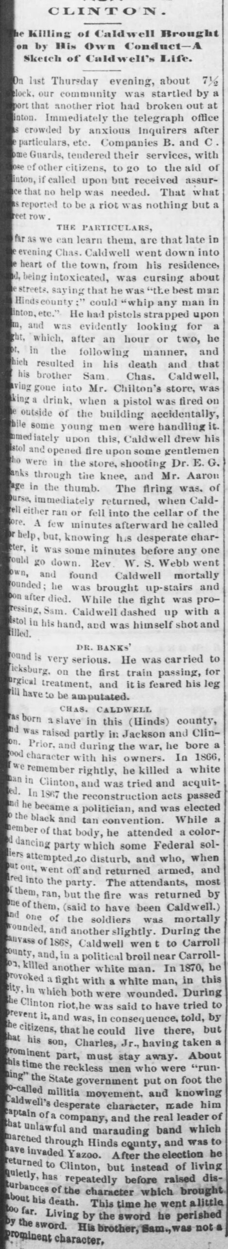 CHAS. CALDWELL was born a slave in this (Hinds) county, and was raised partly in Jackson and Clinton. Prior, and during the war, he bore a good character with his owners. In 1866, if we remember rightly, he killed a white man in Clinton, and was tried and acquitted. In 1867 the reconstruction acts passed and he became a politician, and was elected to the black and tan convention. While a member of that body, he attended a colored dancing party which some Federal soldiers attempted to disturb, and who, when put out, went off and returned armed, and fired into the party. The attendants, most of them, ran, but the fire was returned by one of them, (said to have been Caldwell,) and one of the soldiers was mortally wounded, and another slightly. During the canvass of 1868, Caldwell went to Carroll county, and, in a political broil near Carrollton, killed another white man. In 1870, he provoked a fight with a white man, in this city, in which both were wounded. During the Clinton riot, he was said to have tried to prevent it, and was, in consequence, told, by the citizens, that he could live there, but that his son, Charles, Jr., having taken a prominent part, must stay away. About this time the reckless men who were “running” the State government put on foot the so-called militia movement, and knowing Caldwell’s desperate character, made him captain of a company, and the real leader of that unlawful and marauding band which marched through Hinds county, and was to have invaded Yazoo. After the election he returned to Clinton, but instead of living quietly, has repeatedly before raised disturbances of the character which brought about his death. This time he went a little too far. Living by the sword he perished by the sword. His brother, Sam., was not a prominent character.