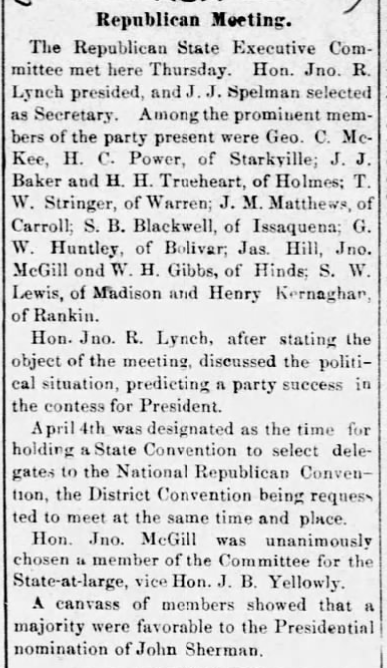 The Republican State Executive Committee met here Thursday. Hon. Jno. R. Lynch presided, and J. J. Spelman selected as Secretary. Among the prominent members of the party present were Geo. C. McKee, H. C. Power, of Starkville; J. J. Baker and H. H. Trueheart, of Holmes; T. W. Stringer, of Warren; J. M. Matthews, of Carroll; S. B. Blackwell, of Issaquena; G. W. Huntley, of Bolivar; Jas. Hill, Jno. McGill and W. H. Gibbs, of Hinds; S. W. Lewis, of Madison and Henry Kernaghan, of Rankin.
