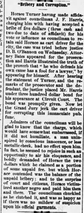 Horace Turner having made affidavit against councilman J. F. Harris, charging him with having accepted a bribe of five dollars (three cash and two due to date of affidavit) for his vote or influence as councilman to retain said Horace as cart driver for the city, the case was tried before justice D. B. O’Bannon on Wednesday. Attorney Bates appeared for the prosecution and Harris illustrated the truth of the proverb that “he who defends his own cause has a fool for a lawyer,” by appearing for himself. After hearing the statement of Turner, and the remarks of the prosecutor and the defendant, the justice placed Mr. Harris under three hundred dollar bond for his appearance at Circuit Court. The bond was promptly given. Now let the Grand Jury jerk the cart driver for corrupting this immaculate pub. func.