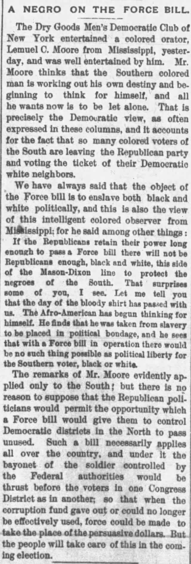 “If the Republicans retain their power long enough to pass a Force bill there will not be Republicans enough, black and white, this side of the Mason-Dixon line to protect the negroes of the South. That surprises some of you, I see. Let me tell you that the day of the bloody shirt has passed with us. The Afro-American has begun thinking for himself. He finds that he was taken from slavery to be placed in political bondage, and he sees that with a Force bill in operation there would be no such thing possible as political liberty for the Southern voter, black or white.”
